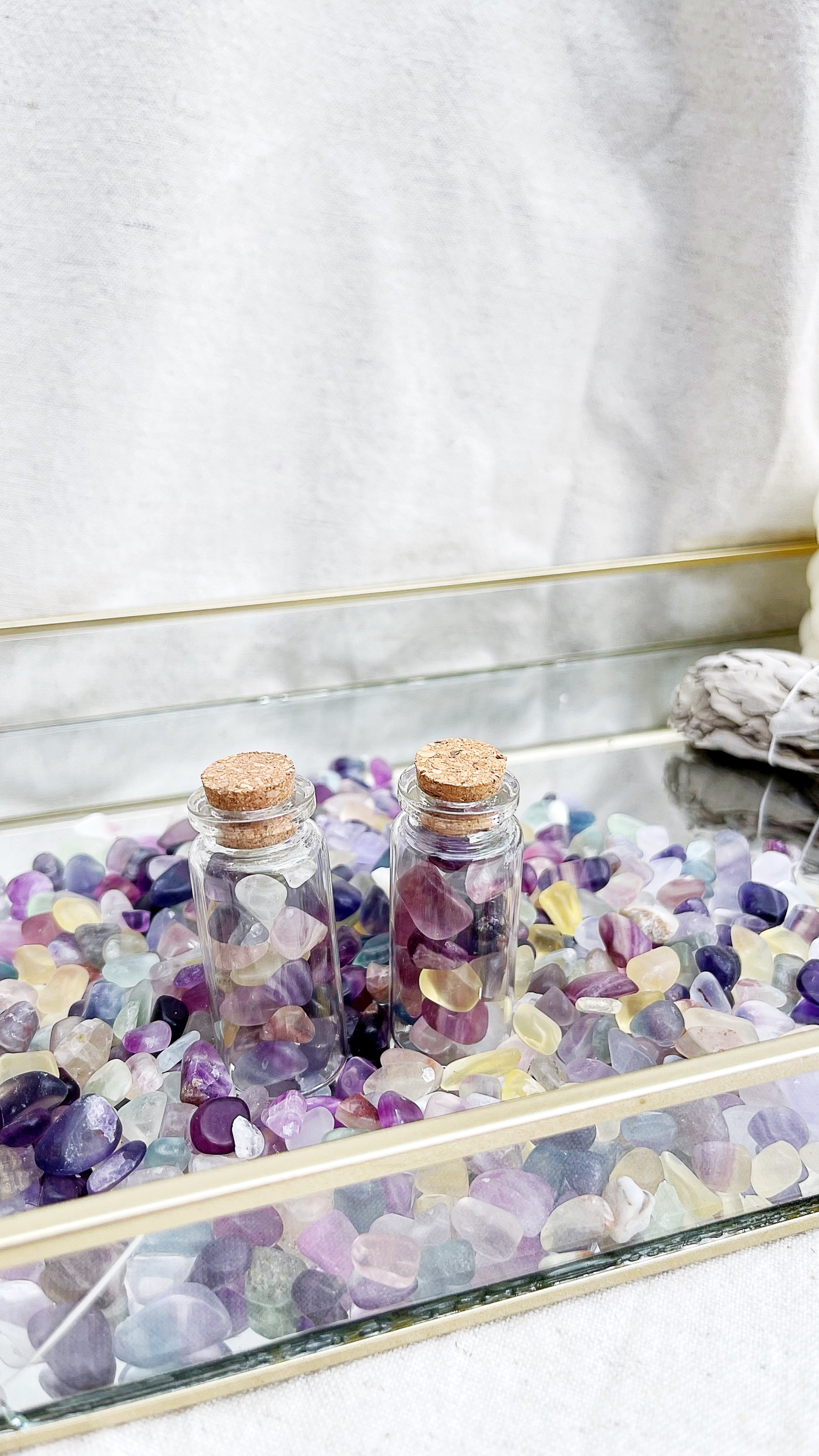 **Please note, you will receive one glass jar of Rainbow fluorite chips. The total weight varies from 30-35g**