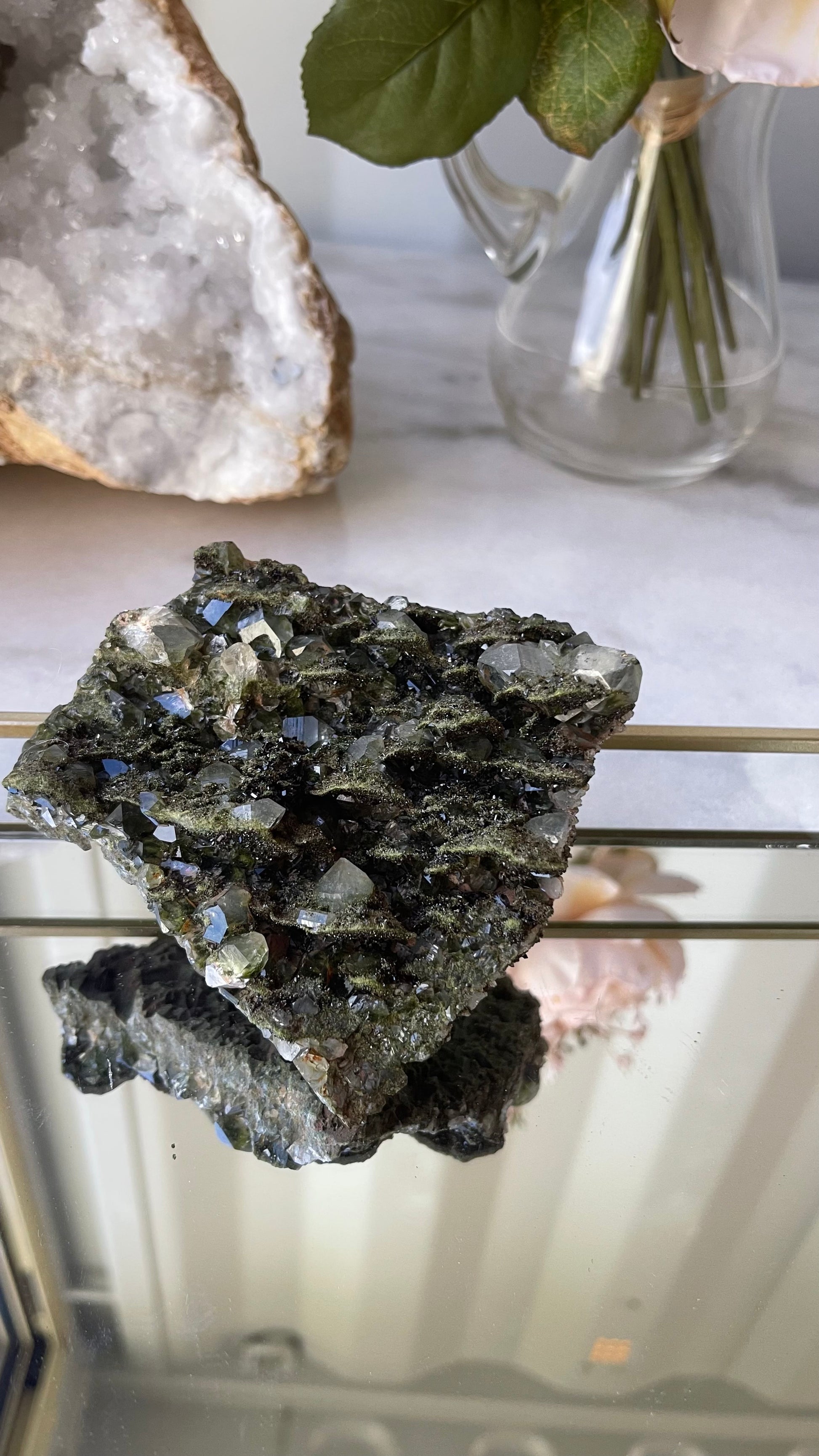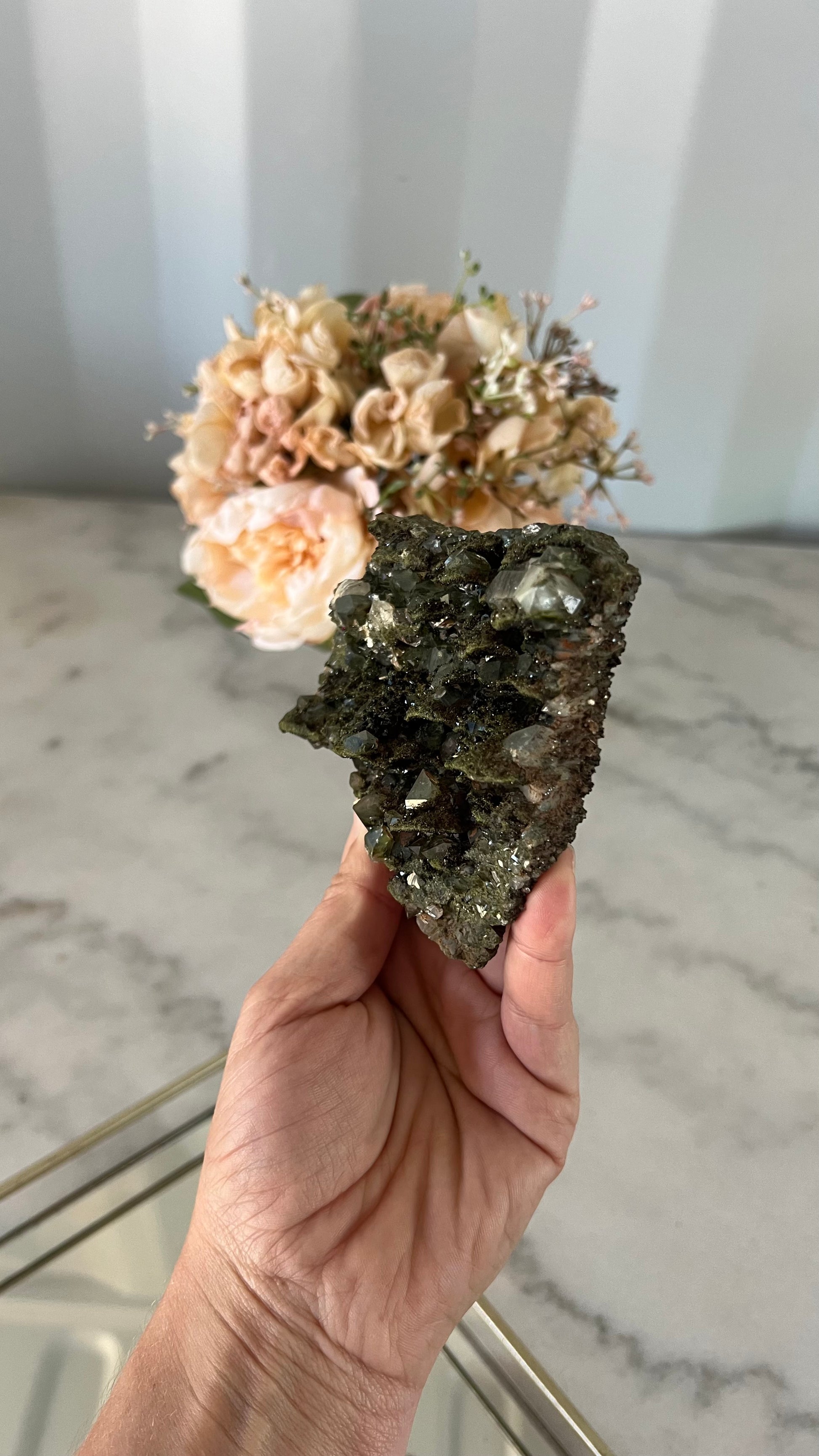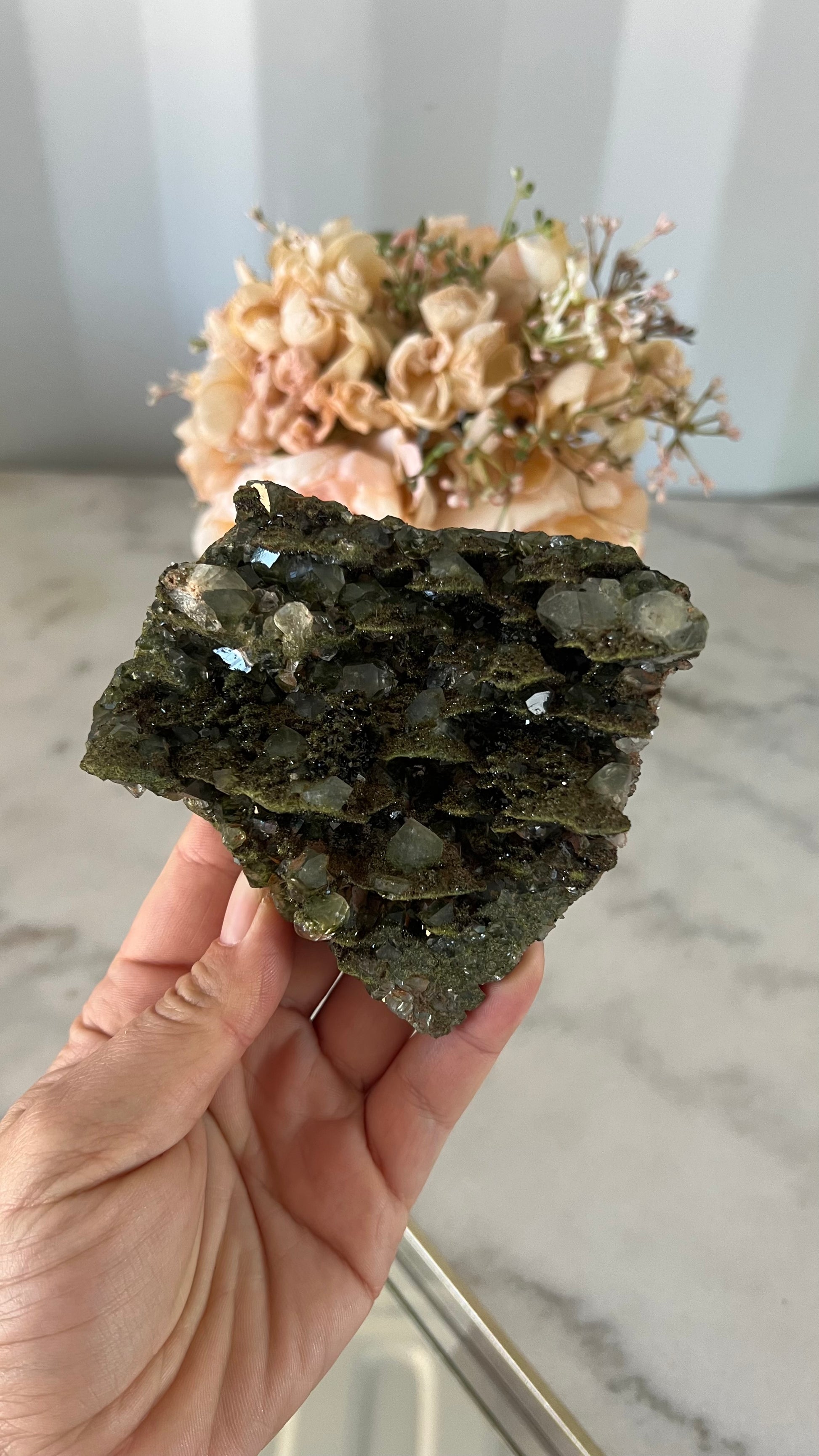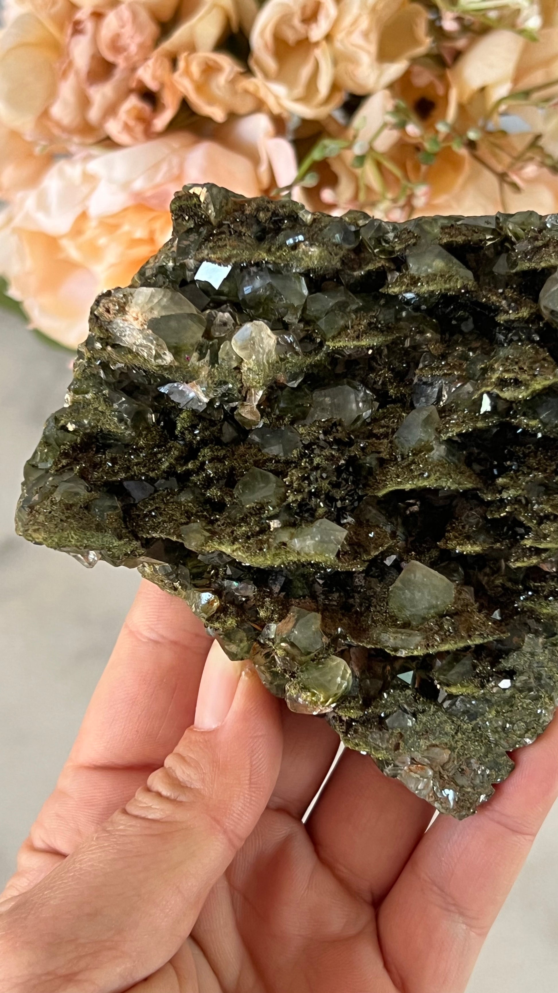 When forest green epidote merges with clear quartz, their energies intertwine to create a potent synergy. It provides profound transformations of letting go of the old and bringing in the new. The powerful duo allows us to clear any emotional blockages within ourselves & foster a sense of well-being.