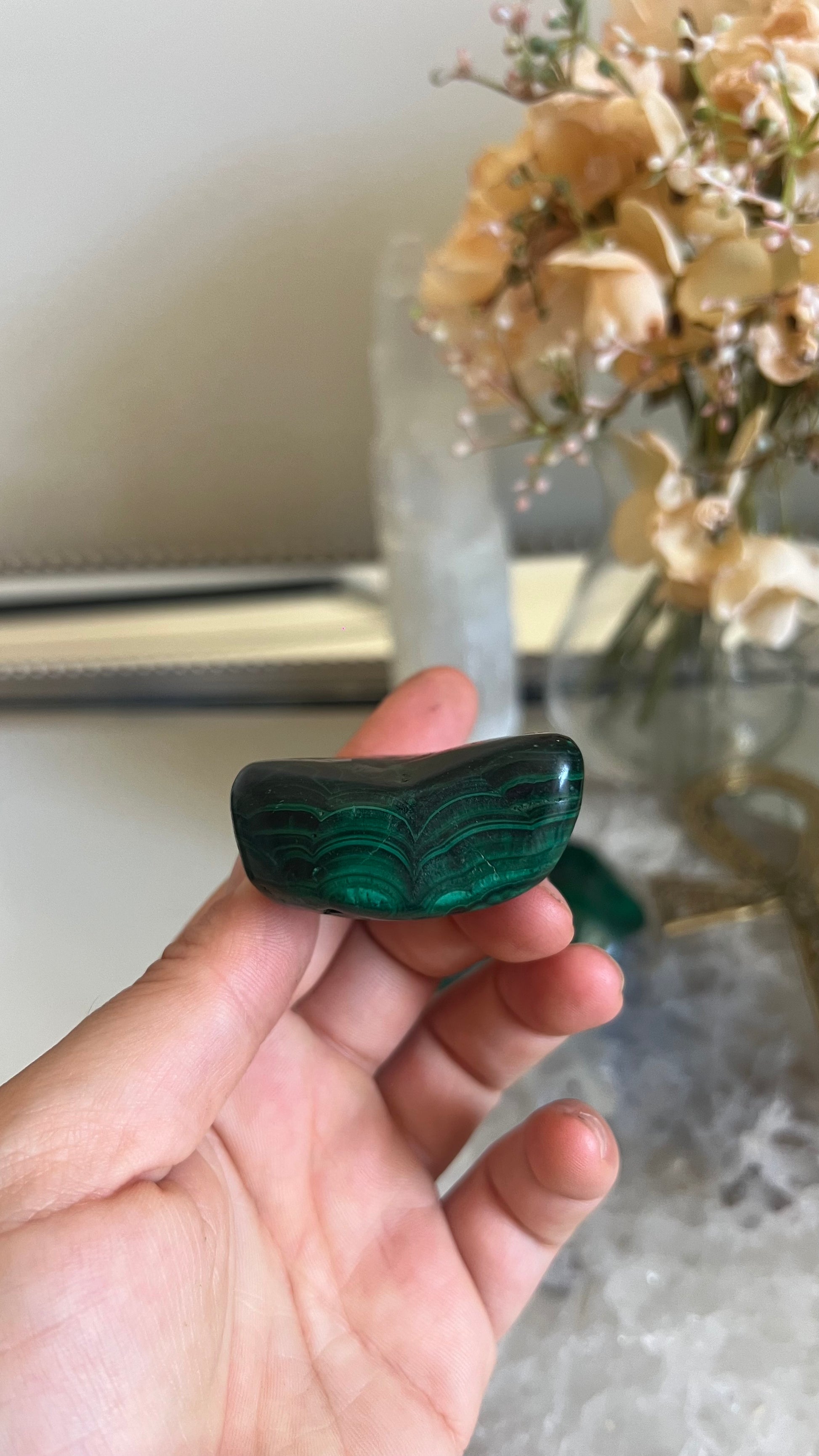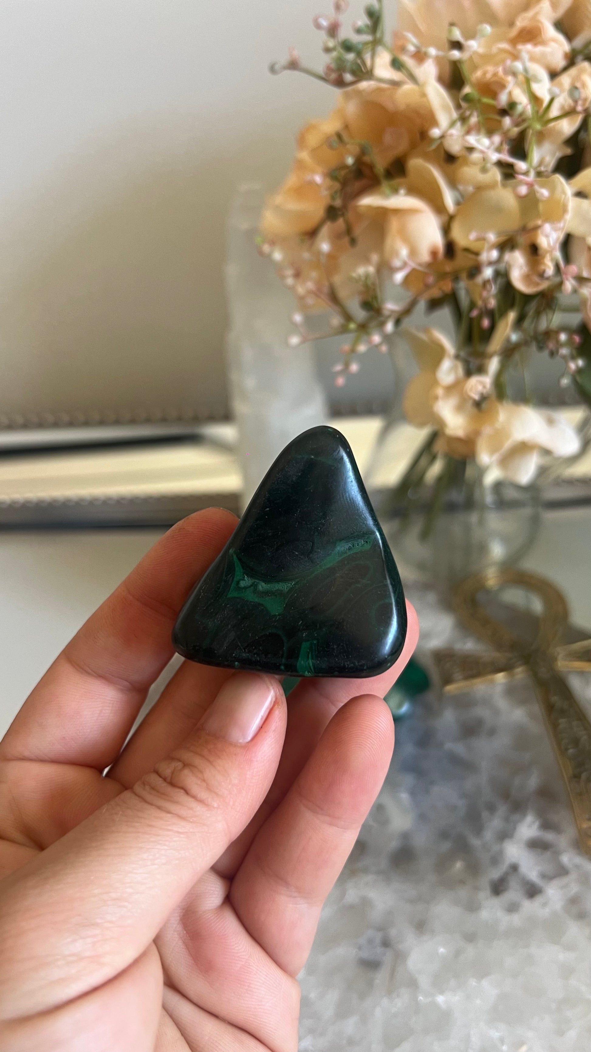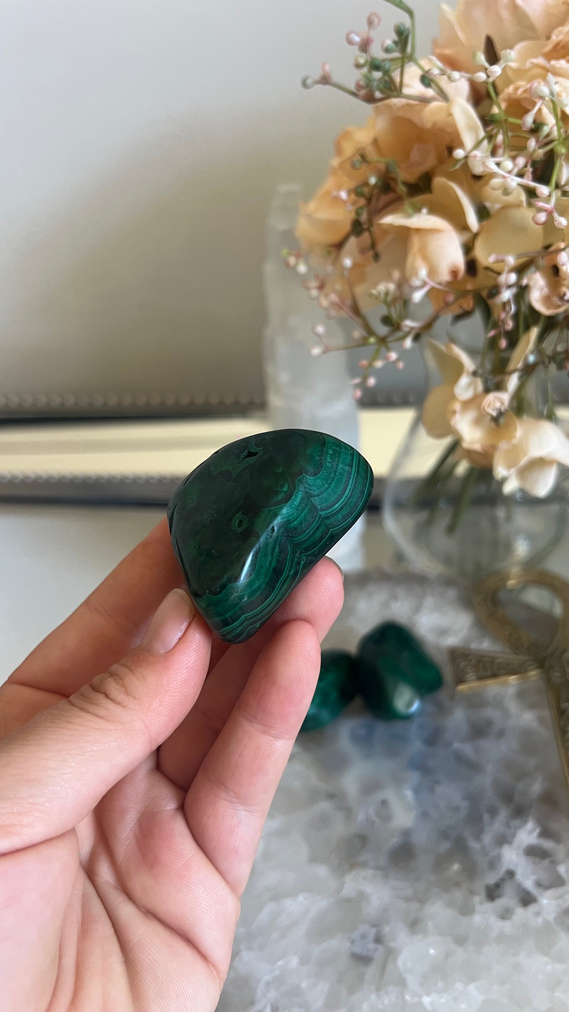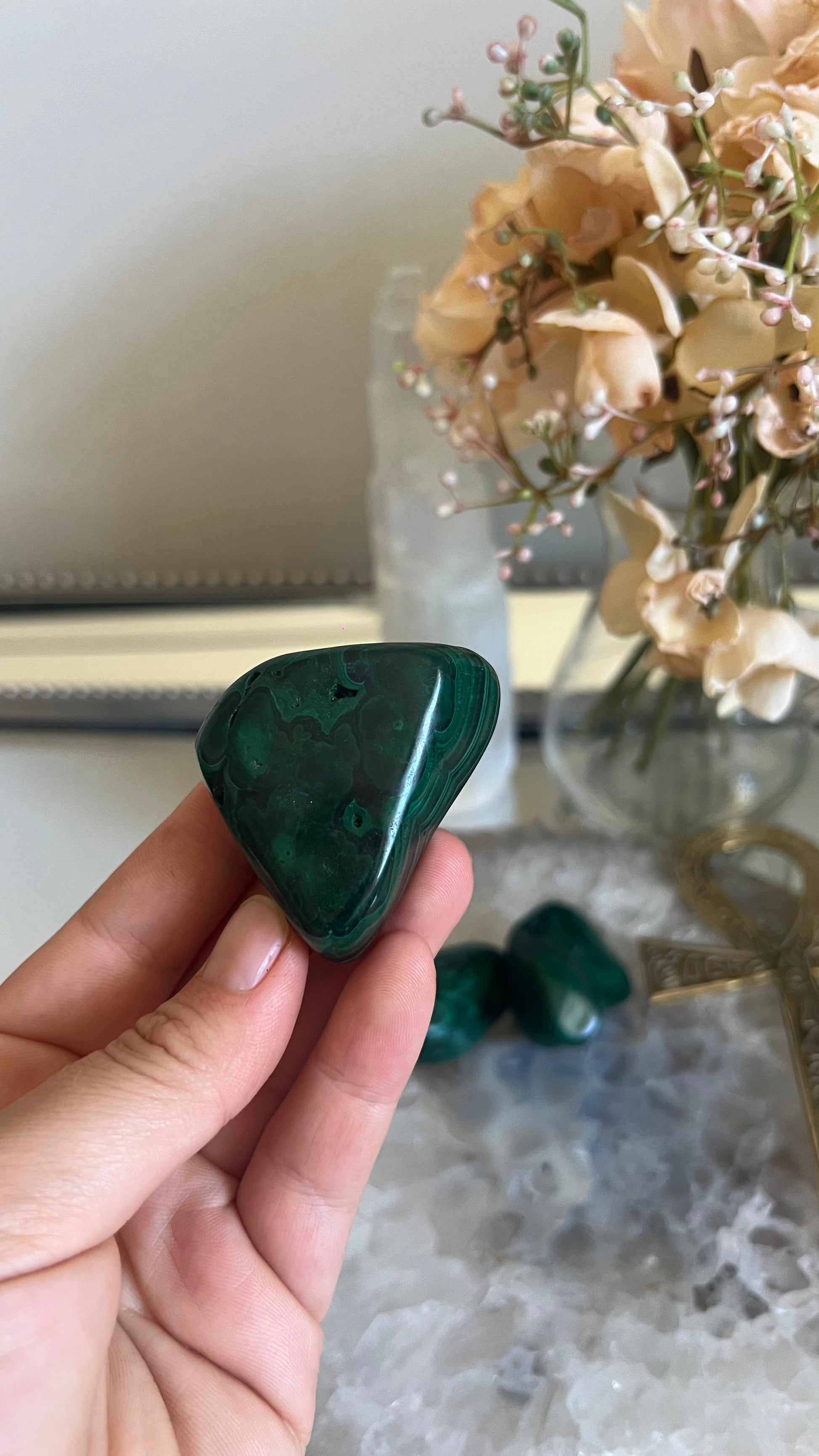 Stone of Transformation." Malachite has the ability to absorb negative energies and bring deep emotional healing to oneself. It’s swirling green patterns represent growth, change, and renewal, making it a perfect crystal for those seeking to break free from negative cycles or personal blockages.