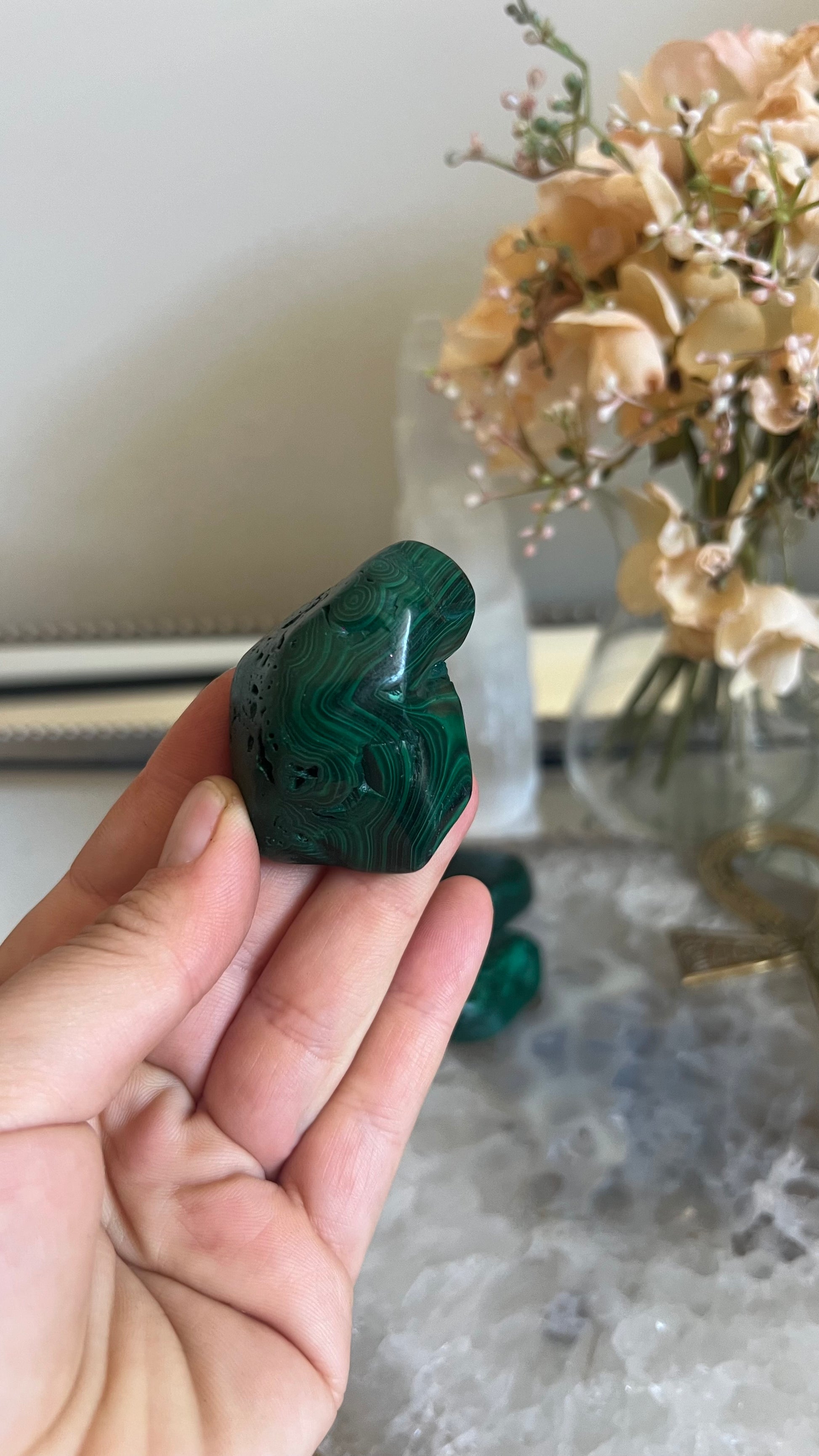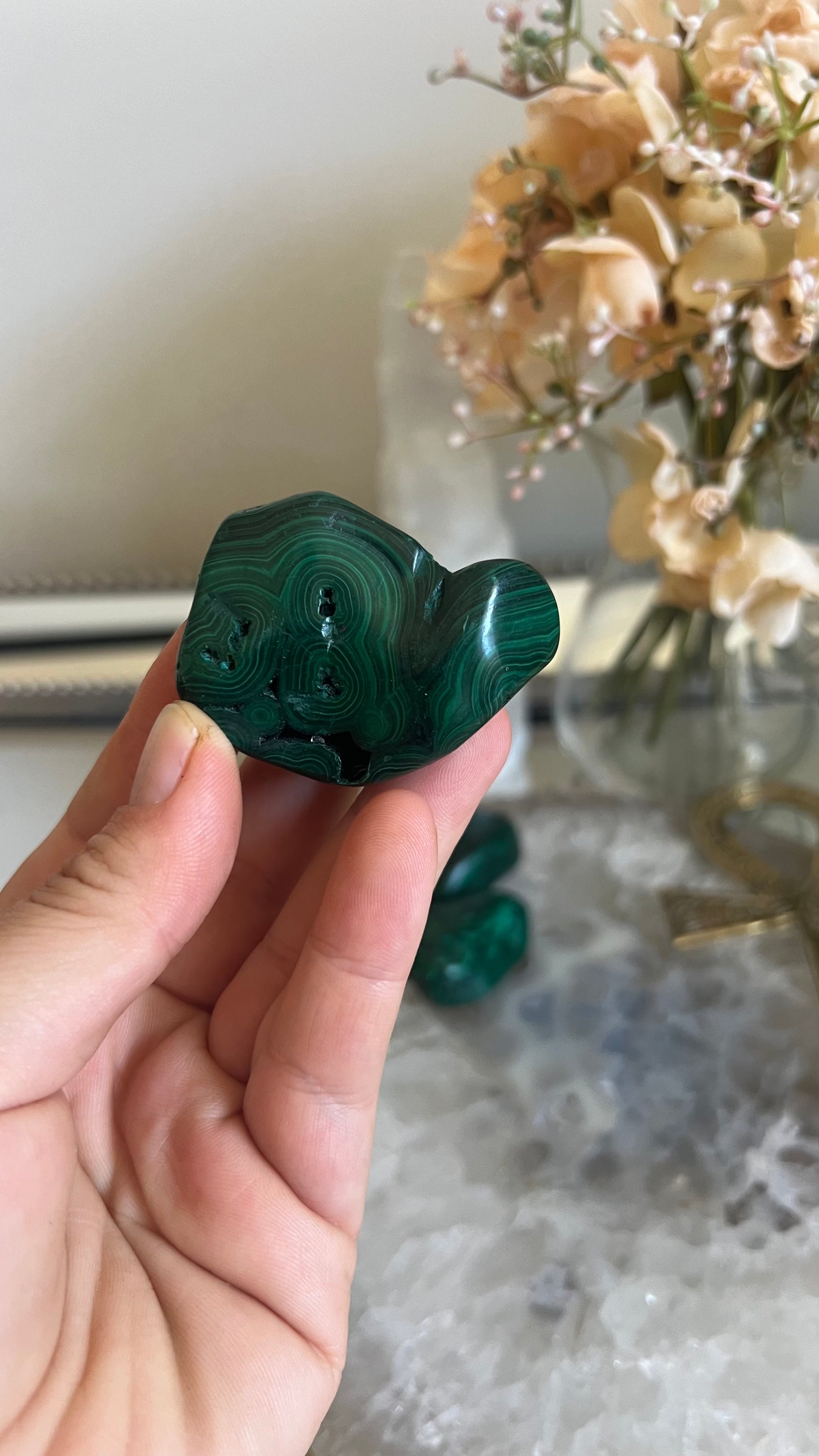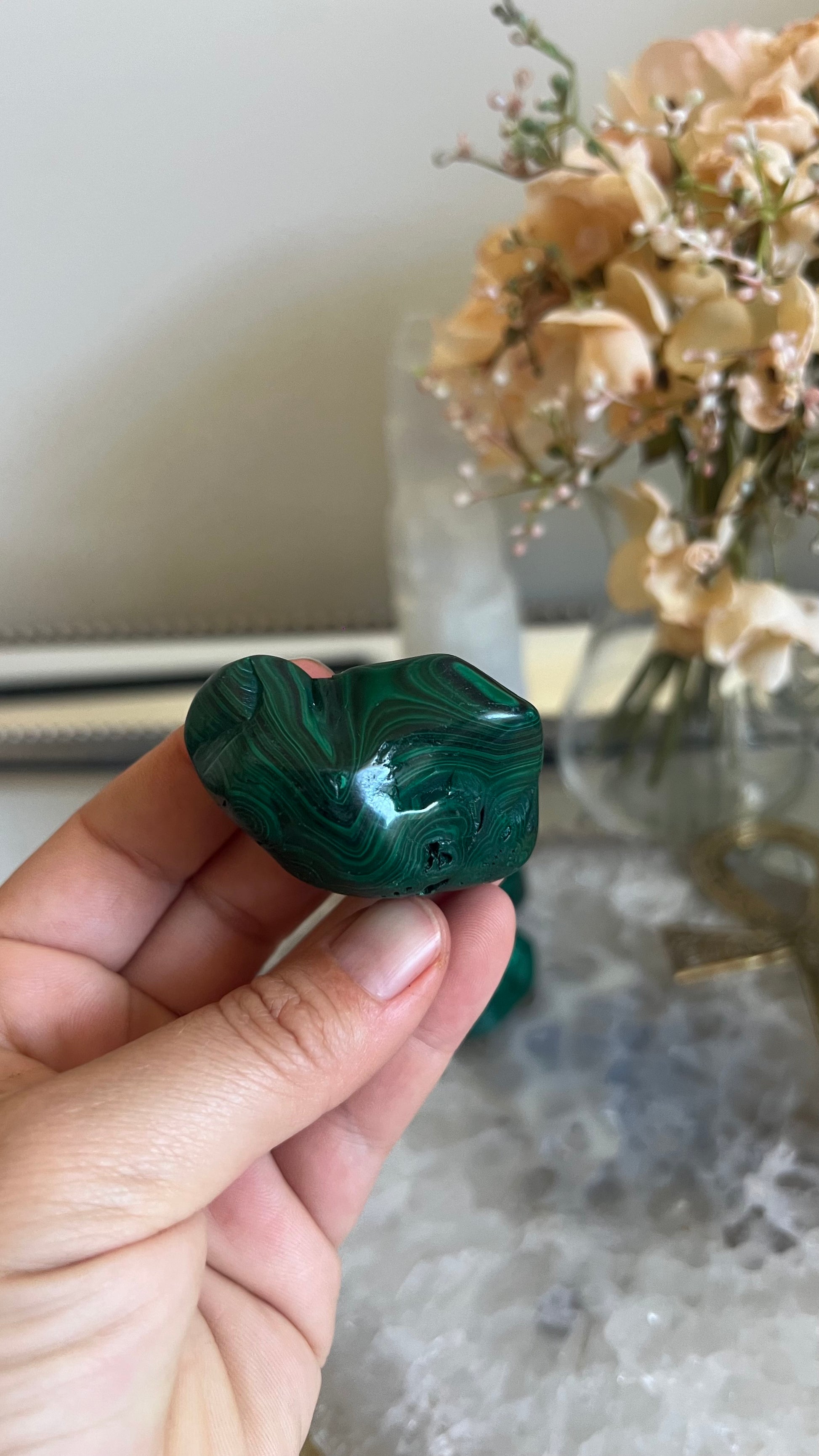 Stone of Transformation." Malachite has the ability to absorb negative energies and bring deep emotional healing to oneself. It’s swirling green patterns represent growth, change, and renewal, making it a perfect crystal for those seeking to break free from negative cycles or personal blockages.