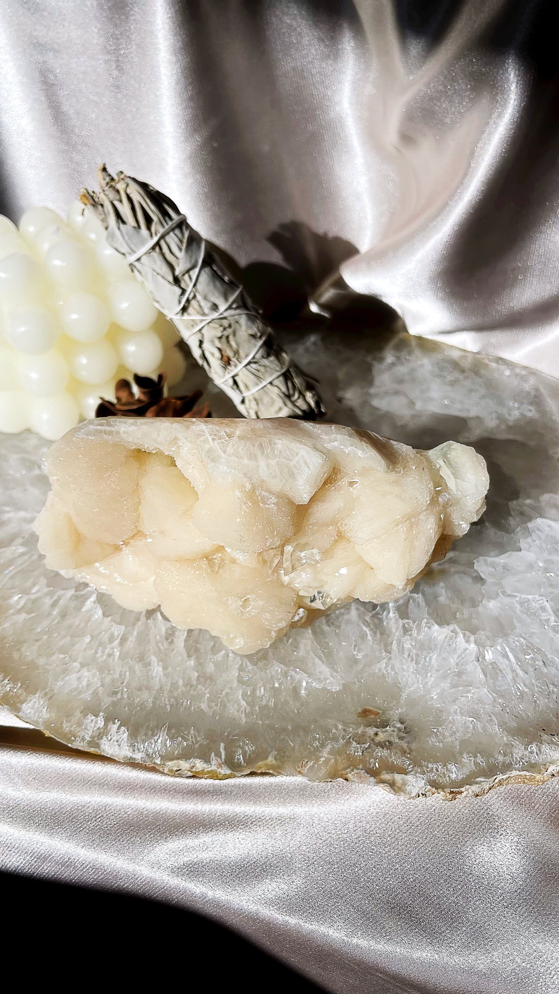 Stilbite is a compassionate stone with soothing vibrations that can be felt upon touching it. It carries the vibration of universal love. It emits loving and healing vibrations, filling the environment with joyful, passionate, and uplifting energies. This stone connects the heart, third eye, and crown chakras, enabling one to clearly see the emotions that are weighing on their heart space.