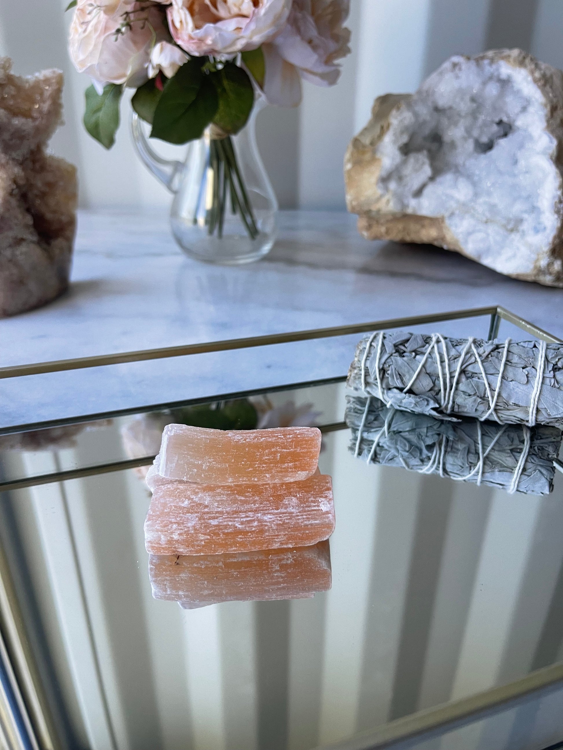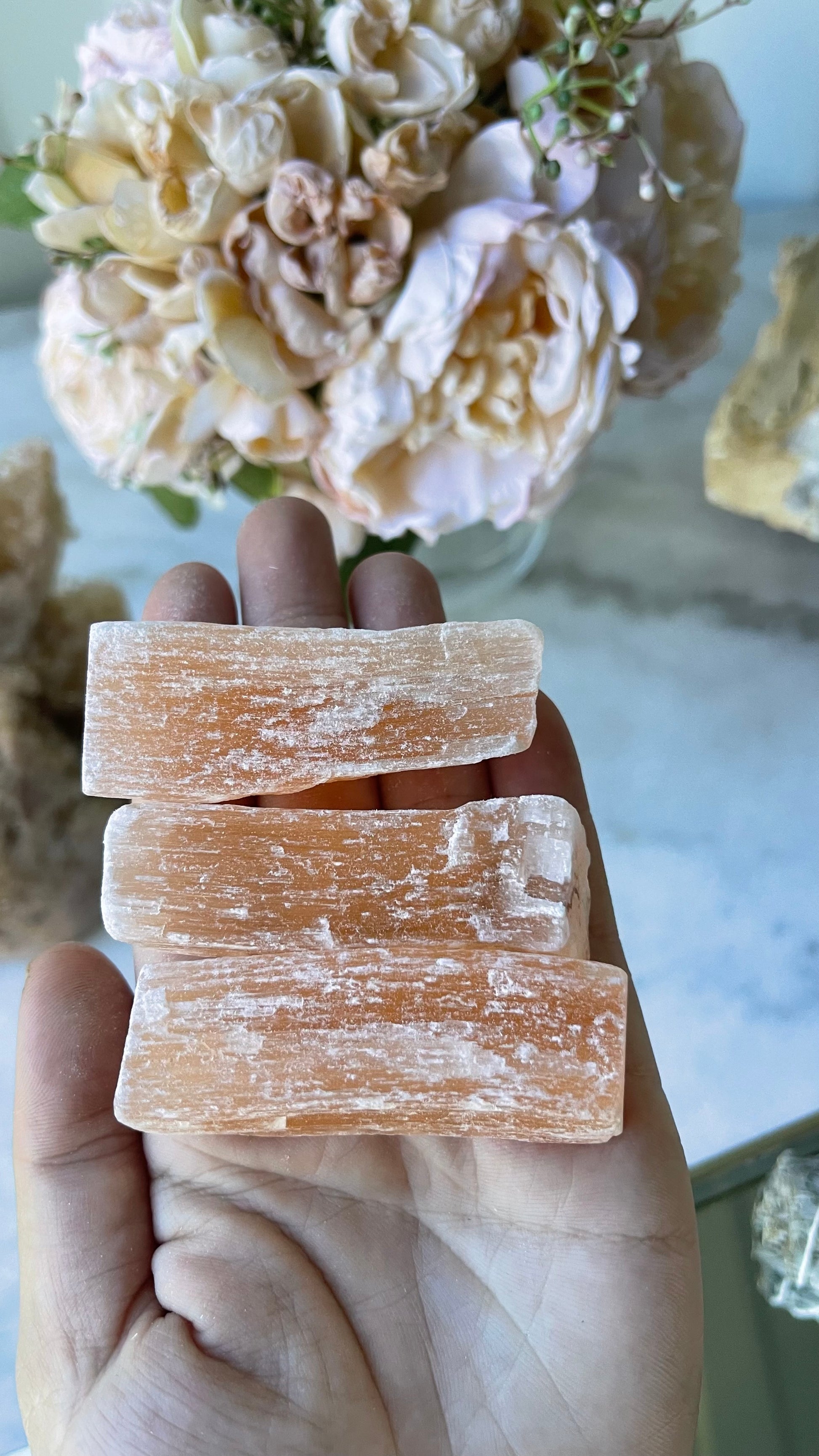Peach Selenite is believed to facilitate deep emotional cleansing, helping to release negative emotions and patterns while fostering a sense of inner peace and serenity. It is also associated with enhancing intuition, promoting self-awareness, and encouraging forgiveness and compassion towards oneself and others. Whether you're drawn to its soothing aesthetic or its profound energetic properties, Peach Selenite serves as a gentle reminder to embrace the beauty of simplicity and the power of love in all its forms.